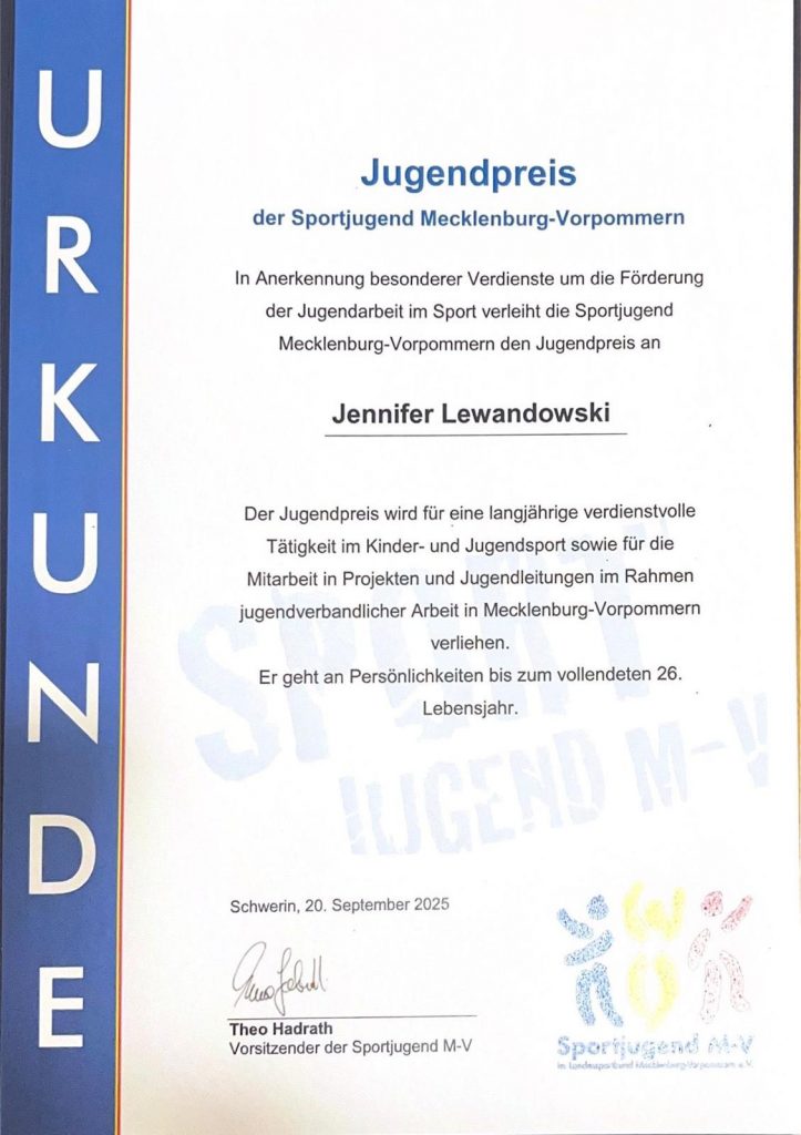 Jennifer erhielt dafür den Jugendpreis der Sportjugend M-V und sie ist damit die erste Jugendliche auf Rügen, die diese Auszeichnung bekam. Wir als Verein sind stolz so eine engagierte Jugendliche in den Reihen zu haben.
